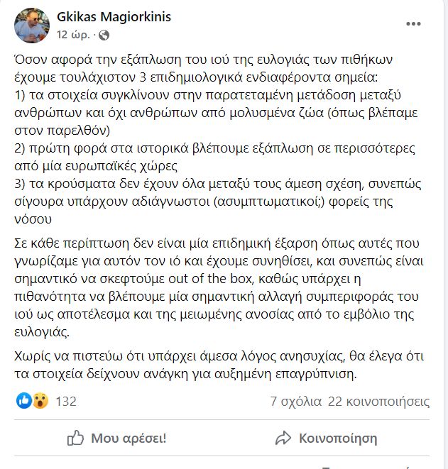 Σε κάθε περίπτωση δεν είναι μία επιδημική έξαρση όπως αυτές που γνωρίζαμε για αυτόν τον ιό και έχουμε συνηθίσει, και συνεπώς είναι σημαντικό να σκεφτούμε out of the box, καθώς υπάρχει η πιθανότητα να βλέπουμε μία σημαντική αλλαγή συμπεριφοράς του ιού ως αποτέλεσμα και της μειωμένης ανοσίας από το εμβόλιο της ευλογιάς.