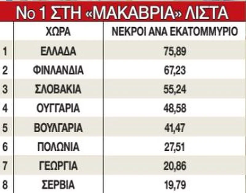 Ο πίνακας αποτυπώνει τη μεταβολή των θανάτων ανά εκατομμύριο πολιτών από τις 15 Μαρτίου έως τις 5 Απριλίου. Το γεγονός ότι η χώρα μας βρίσκεται πρώτη με μεγάλη διαφορά από την πλειονότητα των χωρών της ανατολικής Ευρώπης φανερώνει τα εγκληματικά λάθη που έχουν γίνει τους τελευταίους μήνες στη διαχείριση της πανδημίας.