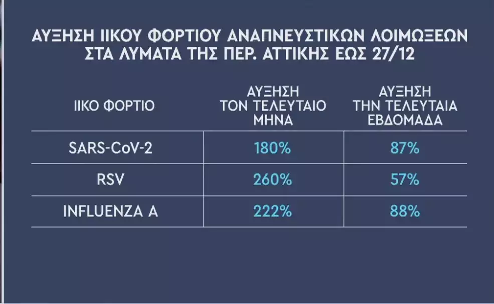 «Προφανώς το υλικό φορτίο του κορονοϊού είναι πολύ μεγαλύτερο από τα άλλα δύο, αλλά το ότι συνυπάρχουν και οι άλλοι δύο ιοί (γρίπη και RSV) κάνει το κοκτέιλ αυτό αρκετά σοβαρό» ανέφερε διευκρινίζοντας ότι η τελευταία εβδομάδα του 2023 έδειξε αυξήσεις της τάξης του 85 – 90% σε αυτούς τους ιούς και αυτό σημαίνει ότι τις επόμενες δύο τρεις εβδομάδες θα έχουμε ακόμα μεγαλύτερο ιικό φορτίο.