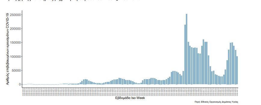 Την εβδομάδα αναφοράς καταγράφηκαν 100.421 κρούσματα COVID-19 (9.626 ανά εκατoμμύριο πληθυσμού: -19% εβδομαδιαία μεταβολή) εκ των οποίων οι επαναλοιμώξεις αφορούν το 21% των λοιμώξεων.