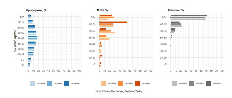 Στο Διάγραμμα παρουσιάζεται το ποσοστό ανά ηλικιακή ομάδα των κρουσμάτων, νοσηλευόμενων στις MEΘ και ασθενών που απεβίωσαν τις τελευταίες τρεις εβδομάδες.