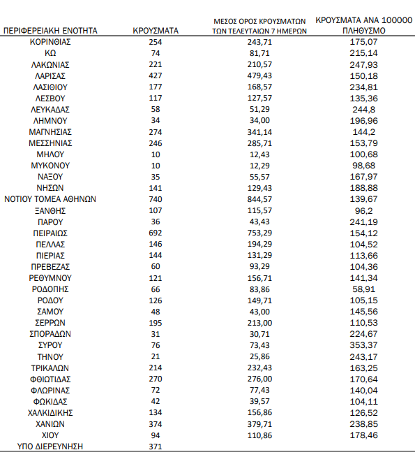 Με βάση τα επιβεβαιωμένα κρούσματα των τελευταίων 7 ημερών, 171 θεωρούνται σχετιζόμενα με ταξίδι από το εξωτερικό και 1.363 είναι σχετιζόμενα με ήδη γνωστό κρούσμα.