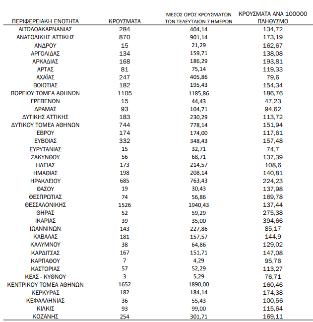 Με βάση τα επιβεβαιωμένα κρούσματα των τελευταίων 7 ημερών, 171 θεωρούνται σχετιζόμενα με ταξίδι από το εξωτερικό και 1.363 είναι σχετιζόμενα με ήδη γνωστό κρούσμα.