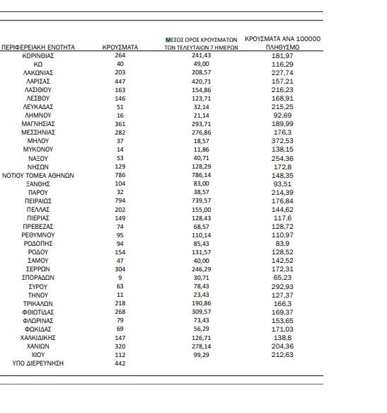 Με βάση τα επιβεβαιωμένα κρούσματα των τελευταίων 7 ημερών, 101 θεωρούνται σχετιζόμενα με ταξίδι από το εξωτερικό και 1.537 είναι σχετιζόμενα με ήδη γνωστό κρούσμα.