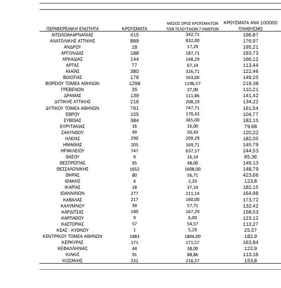 Με βάση τα επιβεβαιωμένα κρούσματα των τελευταίων 7 ημερών, 101 θεωρούνται σχετιζόμενα με ταξίδι από το εξωτερικό και 1.537 είναι σχετιζόμενα με ήδη γνωστό κρούσμα.
