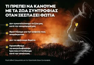 Οδηγίες για την προστασία των κατοικίδιων των πολιτών που καλούνται να εγκαταλείψουν τις περιουσίες τους, λόγω πυρκαγιών δίνει η Ειδική Γραμματεία για την Προστασία Ζώων Συντροφιάς.