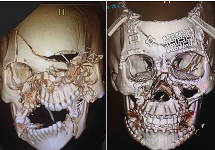 Κοιτάξτε προσεκτικά την εικόνα «μετά» και θα είστε σε θέση να παρατηρήσετε όλα τα μικρά κομμάτια που οι χειρουργοί επανατοποθέτησαν στο κρανίο της ασθενούς για να αποκτήσει και πάλι πρόσωπο αλλά και λειτουργική χρήση του σαγονιού της