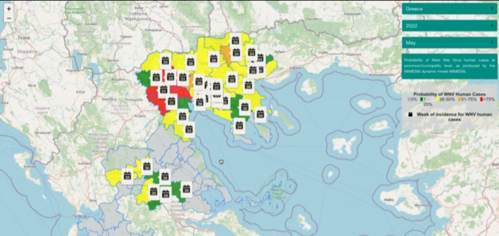 Μιλώντας για την έρευνα που γίνεται από το Αστεροσκοπείο Αθηνών επισήμανε ότι πρόκειται για ένα σύστημα παρακολούθησης που ενημερώνεται συστηματικά κάθε εβδομάδα, κάθε μήνα τα 4 τελευταία χρόνια. «Τα χρώματα που βλέπουμε στους διαφορετικούς δήμους (βλ. χάρτης παρακάτω) υποδηλώνουν διαφορετικό επίπεδο κινδύνου εμφάνισης έστω και ενός κρούσματος του ιού του Δυτικού Νείλου» εξηγώντας ότι αποτελεί ένα χρήσιμο οδηγό για λήψη μέτρων από τις αρμόδιες αρχές.