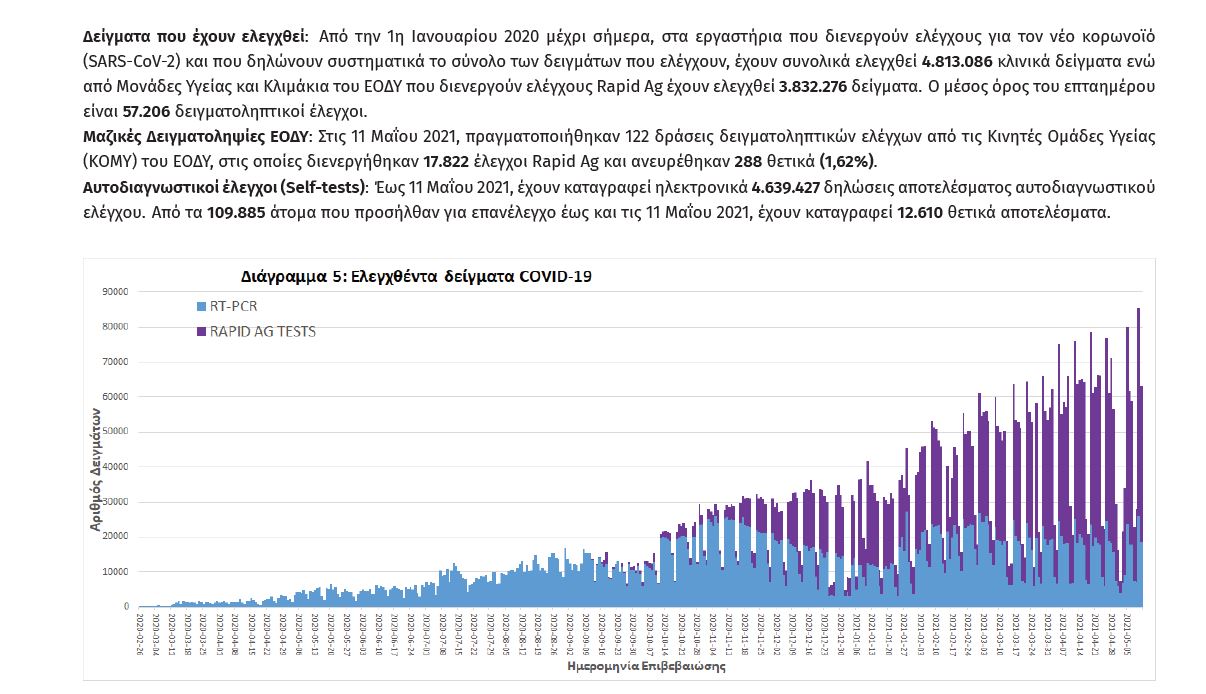 Έτσι, σύμφωνα με την ανακοίνωση του ΕΟΔΥ, έως 11 Μαΐου 2021, έχουν καταγραφεί ηλεκτρονικά 4.639.427 δηλώσεις αποτελέσματος αυτοδιαγνωστικού ελέγχου. Από τα 109.885 άτομα που προσήλθαν για επανέλεγχο έως και τις 11 Μαΐου 2021, έχουν καταγραφεί 12.610 θετικά αποτελέσματα.