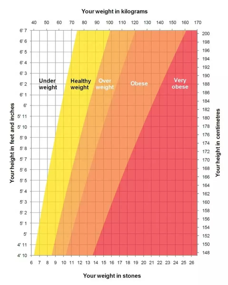 Επισήμανση: Το κίτρινο χρώμα δείχνει το ιδανικό βάρος, οι δύο αποχρώσεις πορτοκαλί χρώματος δείχνει ότι είστε υπέρβαροι, ή πολύ υπέρβαροι (στα όρια του παχύσαρκου ατόμου), το κόκκινο χρώμα ότι είστε σε επίπεδα παχυσαρκίας, ενώ το λευκό χρώμα καταδεικνύει ότι βρίσκεστε στο άλλο (επίσης ανθυγιεινό) άκρο του φάσματος και είστε λιποβαρείς.