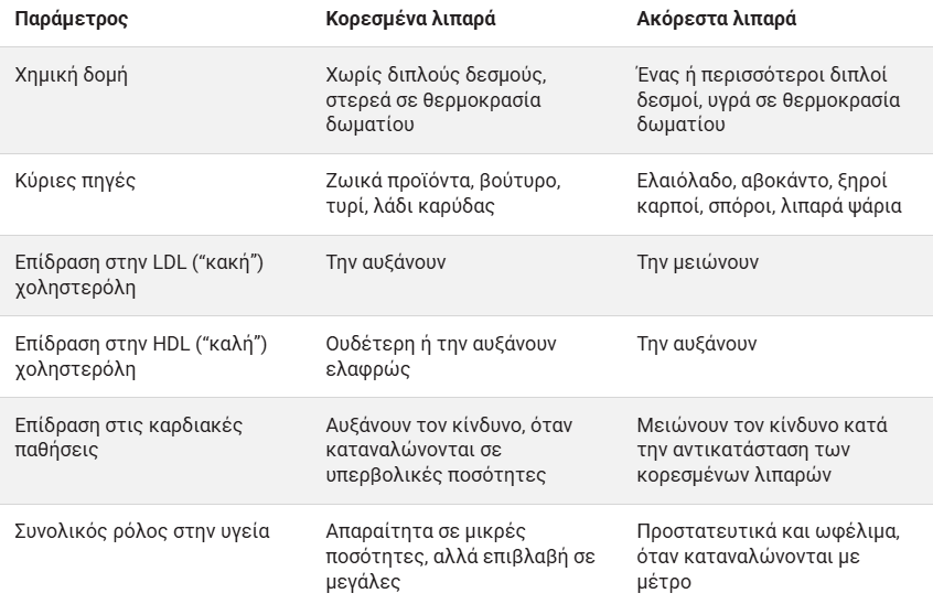Η διατροφή μας περιλαμβάνει διάφορους τύπους λιπαρών, με κυριότερους τα κορεσμένα και τα ακόρεστα. Η επιλογή του σωστού τύπου επηρεάζει σημαντικά την καρδιαγγειακή υγεία.