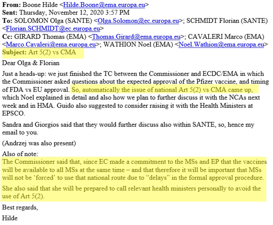 Ακολουθεί ένα μήνυμα ηλεκτρονικού ταχυδρομείου από τη Hilde Boone του EMA, που δηλώνει ότι «η [von der Leyen] θα είναι έτοιμη να καλέσει προσωπικά τους αρμόδιους υπουργούς υγείας για να αποφύγει τη χρήση του Άρθρου 5(2).»