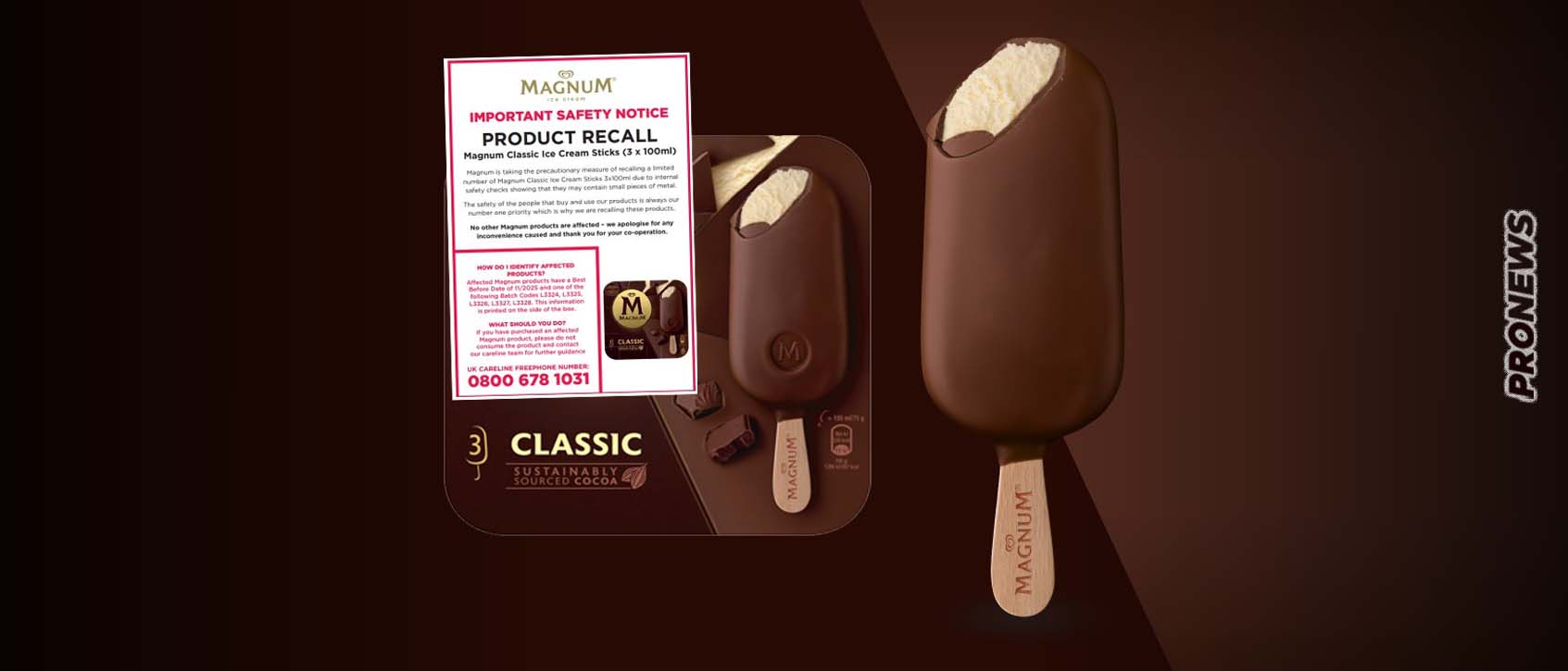 Η Uniliver, ανακοίνωσε ότι ανακαλεί από την αγορά παρτίδες παγωτών της Magnum (Magnum Classic Chocolate Ice Cream Sticks 3 x 100ml), που βρίσκονται σε συσκευασία 3 τεμαχίων, καθώς μέσα βρέθηκαν μεταλλικά κομμάτια!